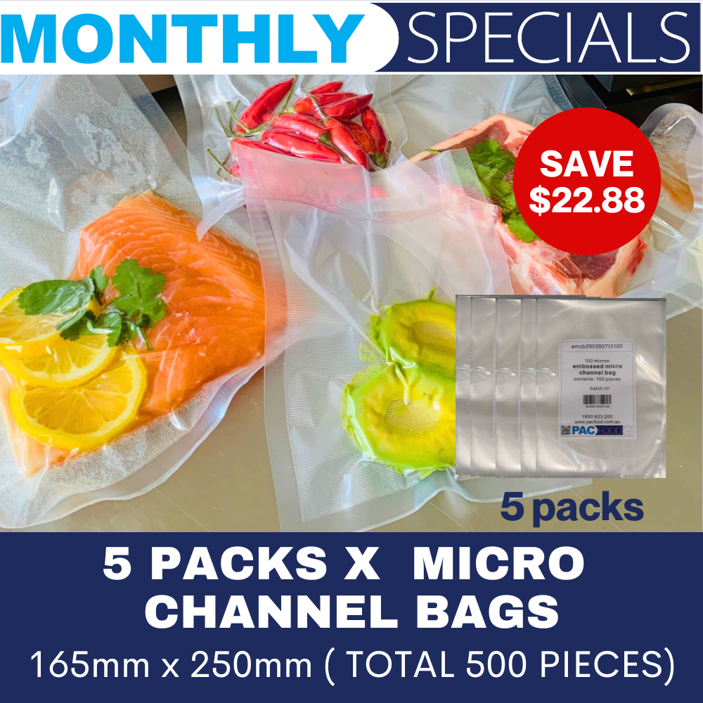 Give your food extra shelf life, stop freezer burn, ensure safe and long storage life with Pac Food’s domestic vacuum sealer bags. To get some very helpful instructions and handy tips on vacuum sealing micro channel bags view our vacuum sealer demonstration videos.