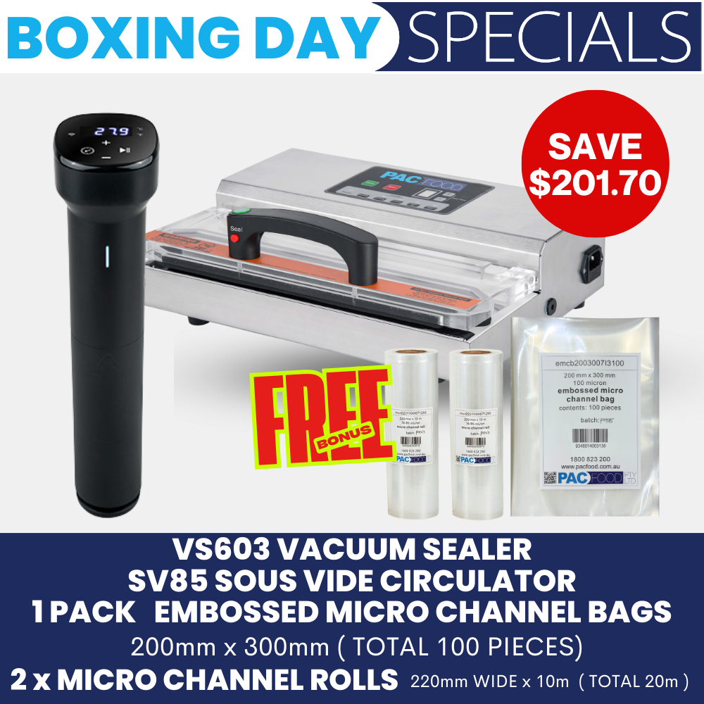 This all-in-one Boxing Day special includes the VS603 Vacuum Sealer, the SV85 Sous Vide Immersion Circulator, plus bonus embossed micro channel bags (100 pcs) and micro channel rolls (20 m total) giving you everything you need to vacuum seal, store, and sous vide with ease.